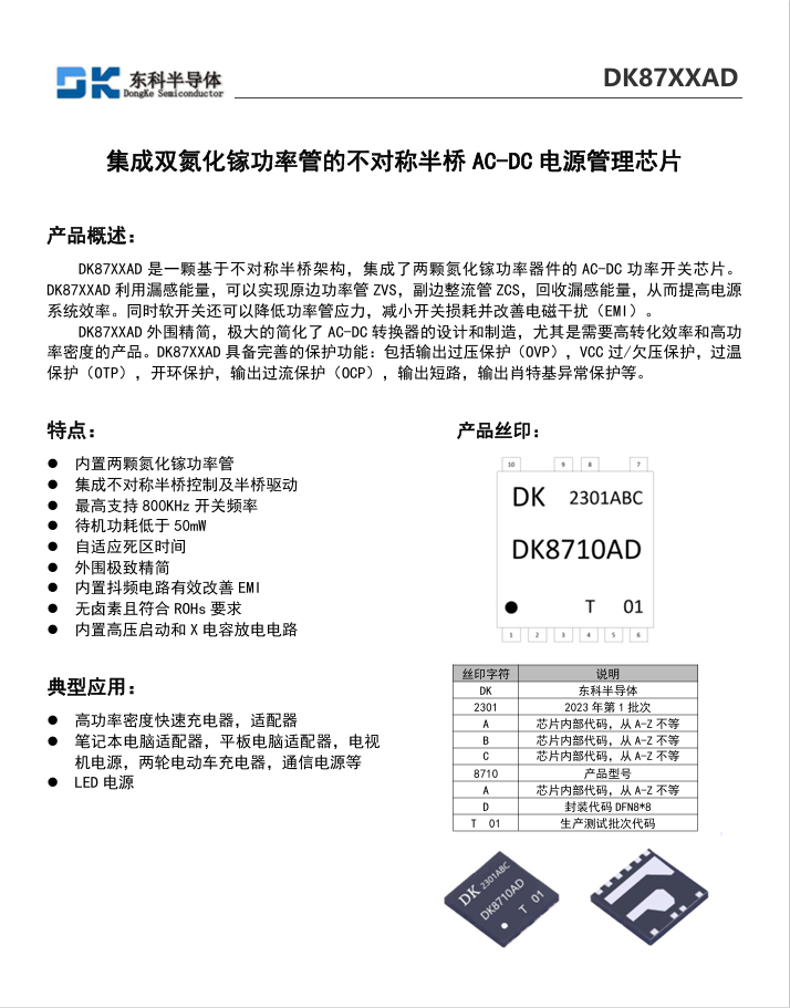東科半導體推出基于不對稱半橋架構的全合封氮化鎵AC-DC電源管理芯片DK8715AD系列