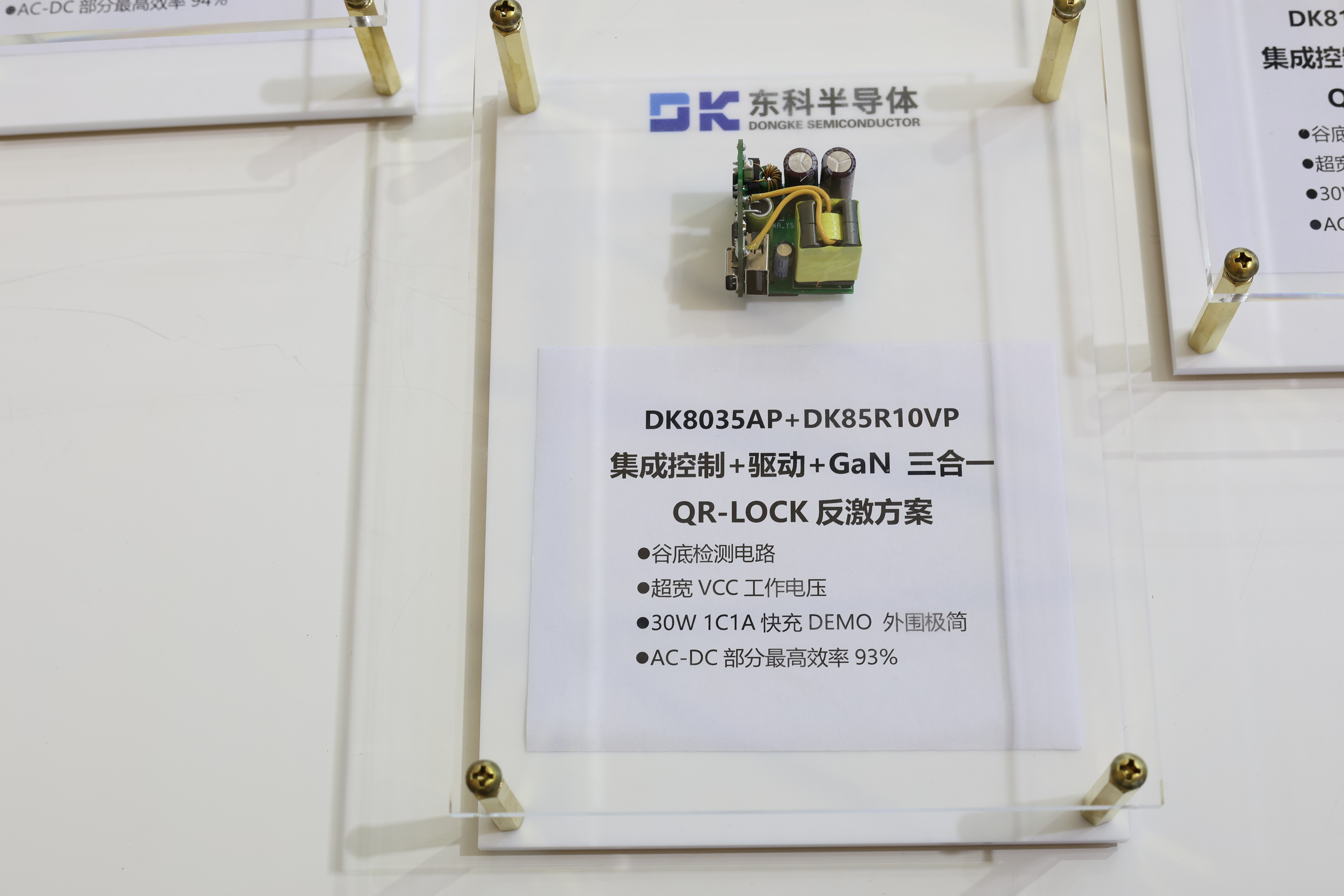 此次重磅展出了東科全新All-in-One全合封氮化鎵AC-DC電源管理芯片(不對稱半橋系列/有源箝位反激系列)。作為市面唯一的All-in-One全合封不對稱半橋解決方案DK87XXAD,有源箝位反激解決方案DK86XXAD。芯片采用三合一設計,單芯片集成AHB/ACF控制+半橋驅動+半橋GAN器件,實現了優異的總線控制功能,提供卓越的性能和效率。
